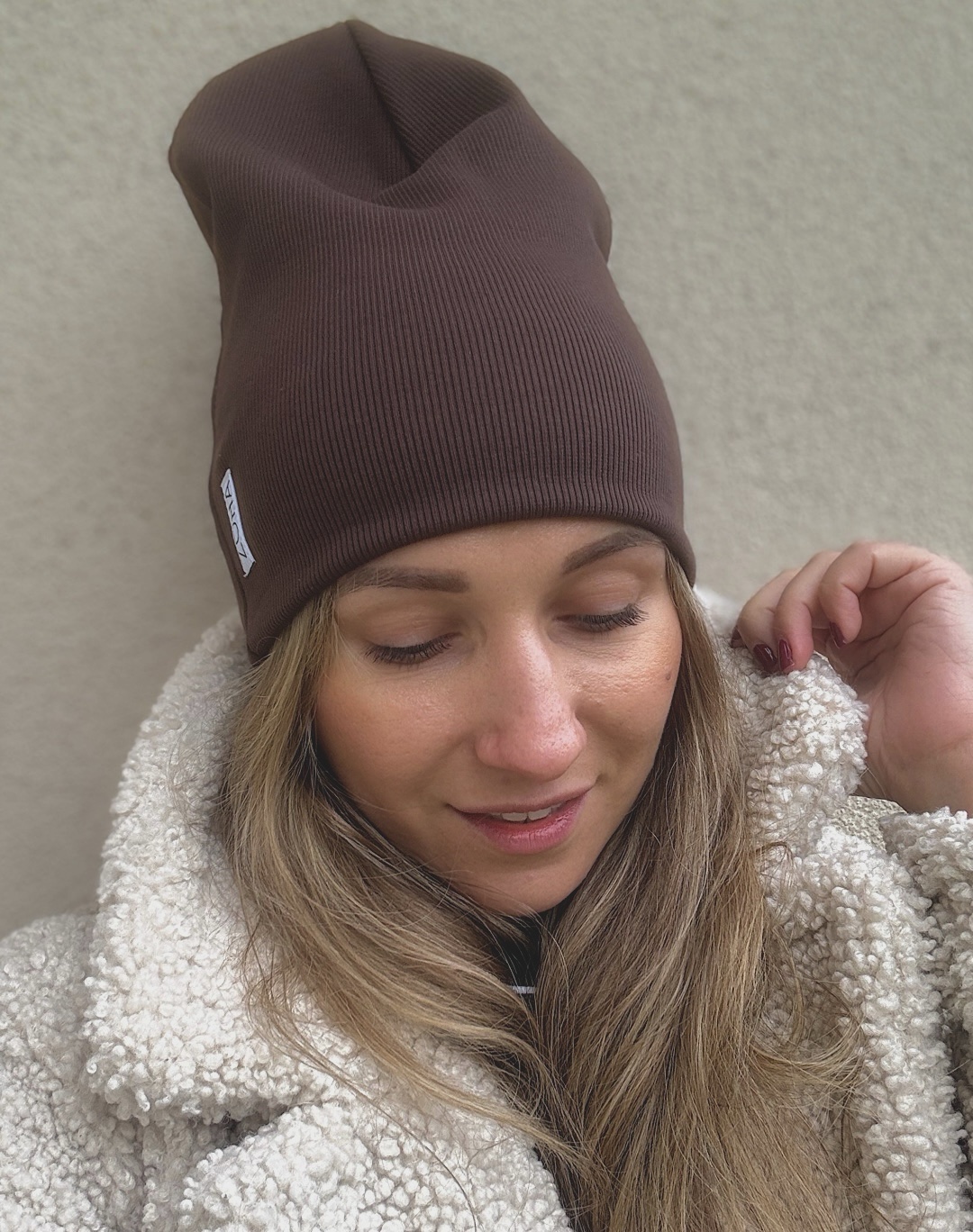Klasyczna czapka damska w odcieniu mlecznej czekolady. Rozmiar uniwersalny.