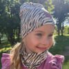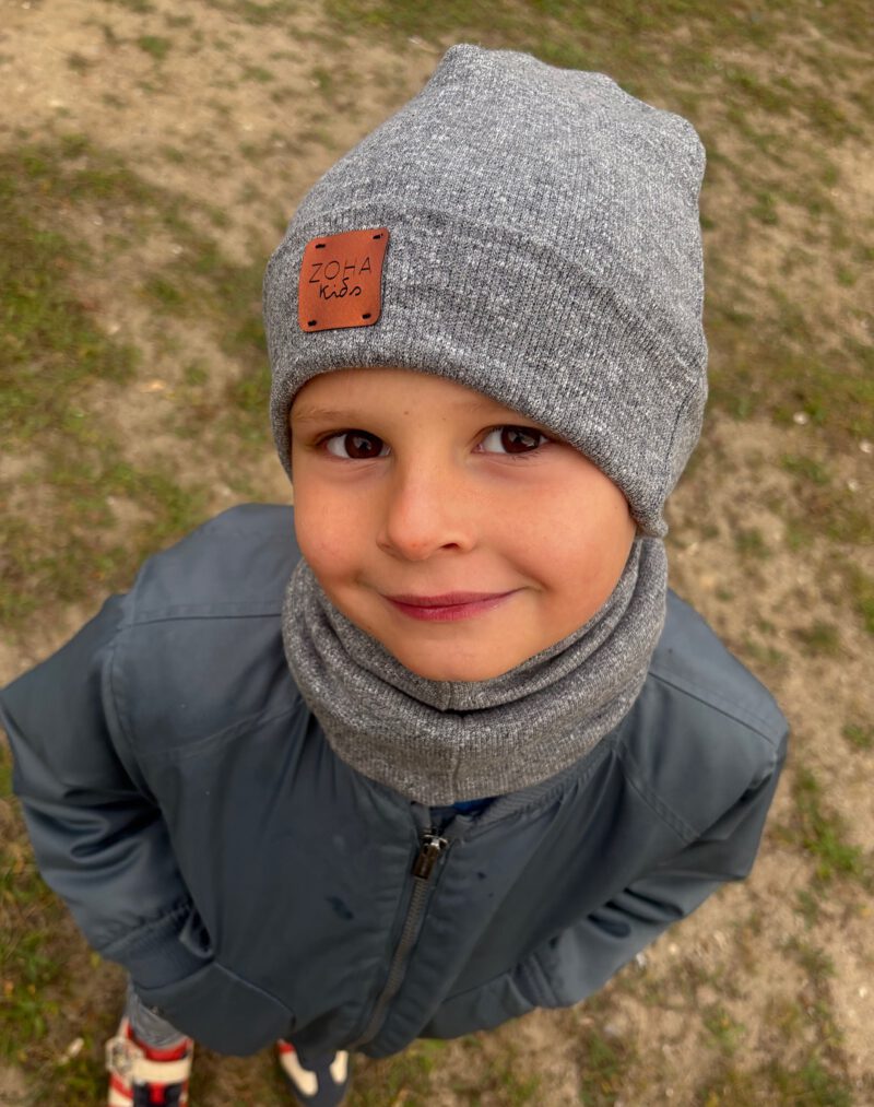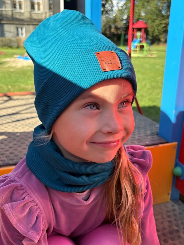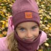 Podwójny komplet z dzianiny prążkowanej. Czapka z wywinięciem. Komin uszyty również z dwóch warstw, idealnie dopasowany do szyjki dziecka. Skórzana naszywka z logo.