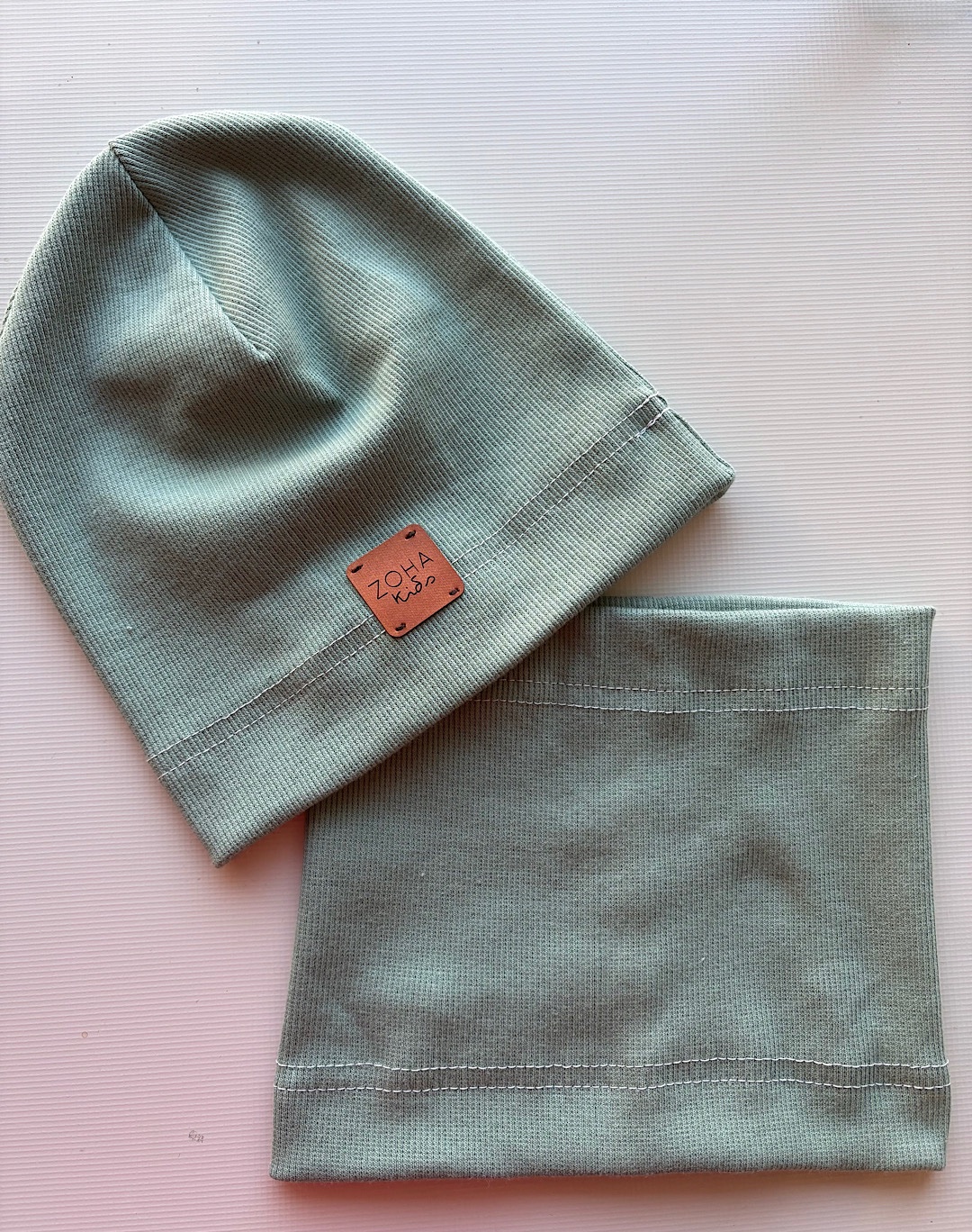Pojedynczy komplet czapka plus komin wykonany z bawełnianej dzianiny prążkowanej