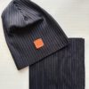 Pojedynczy komplet czapka plus komin wykonany z cienkiej bawełnianej dzianiny w cieniutkie czarno białe paski